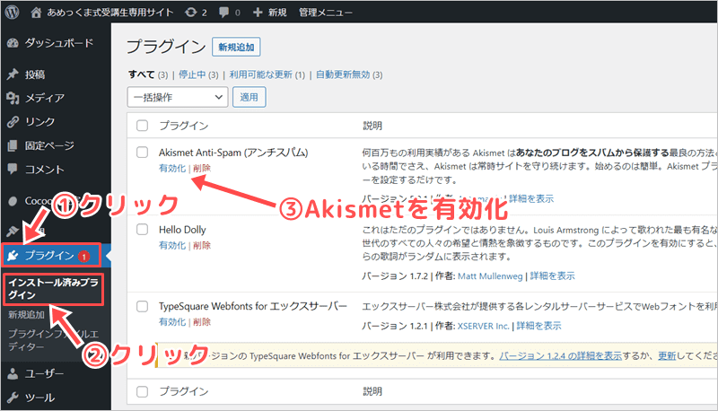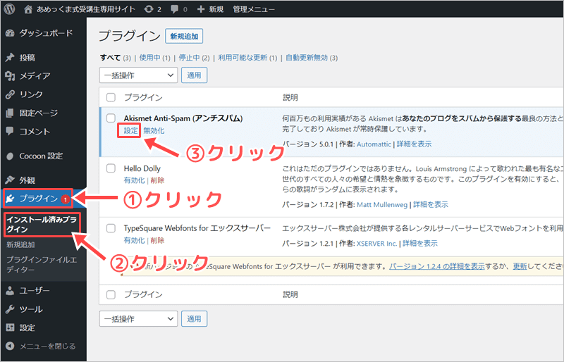 「プラグイン」⇒「インストール済プラグイン」の順に開いて、Akismetの「設定を」クリックしましょう。