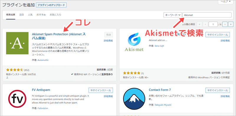 「プラグイン」⇒「新規追加」の順に開いて、「Akismet」で検索すればOKですね。