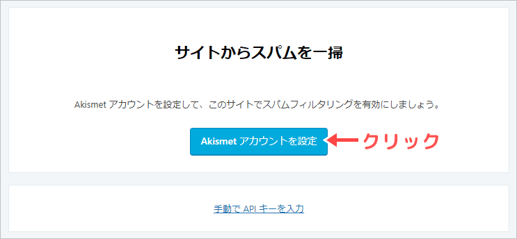 有効化すると、👇の画面が表示されるので「Akismetアカウントを設定」をクリックしましょう。