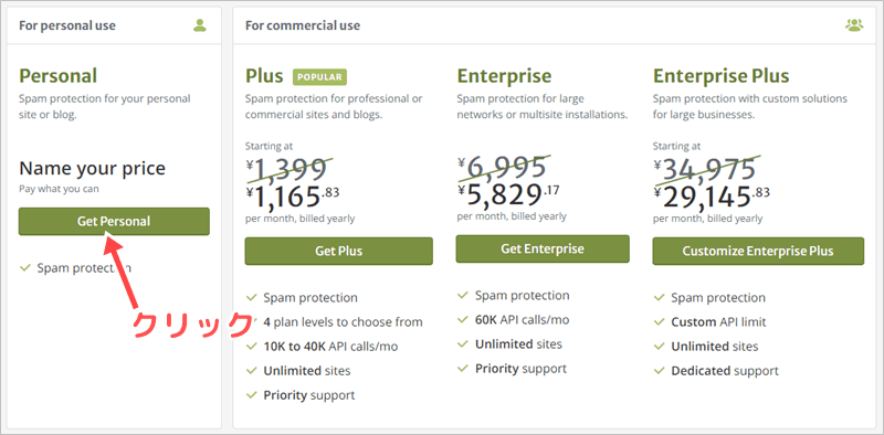 👇の画面に移動するので、「Get Personal」をクリックします。(右側3つは有料プランなので選ばないように!)