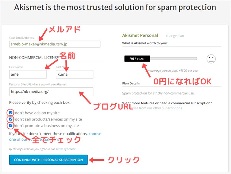 👇のように0円になればOK。メルアド・名前・ブログURLに入力し・3か所チェックして、一番下のボタンをクリックししょう。