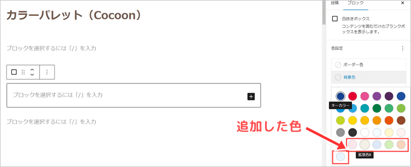 Cocoonのカラーパレットでは、👇の後半6個に好みの色を追加できます。
