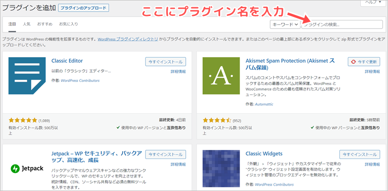 開いた画面の右上の入力欄に、プラグイン名を入力して検索します。