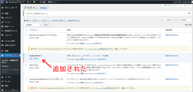 すると今インストールされているプラグイン一覧画面に切り替わり、「Contact Form7」が追加されたことが確認できます。